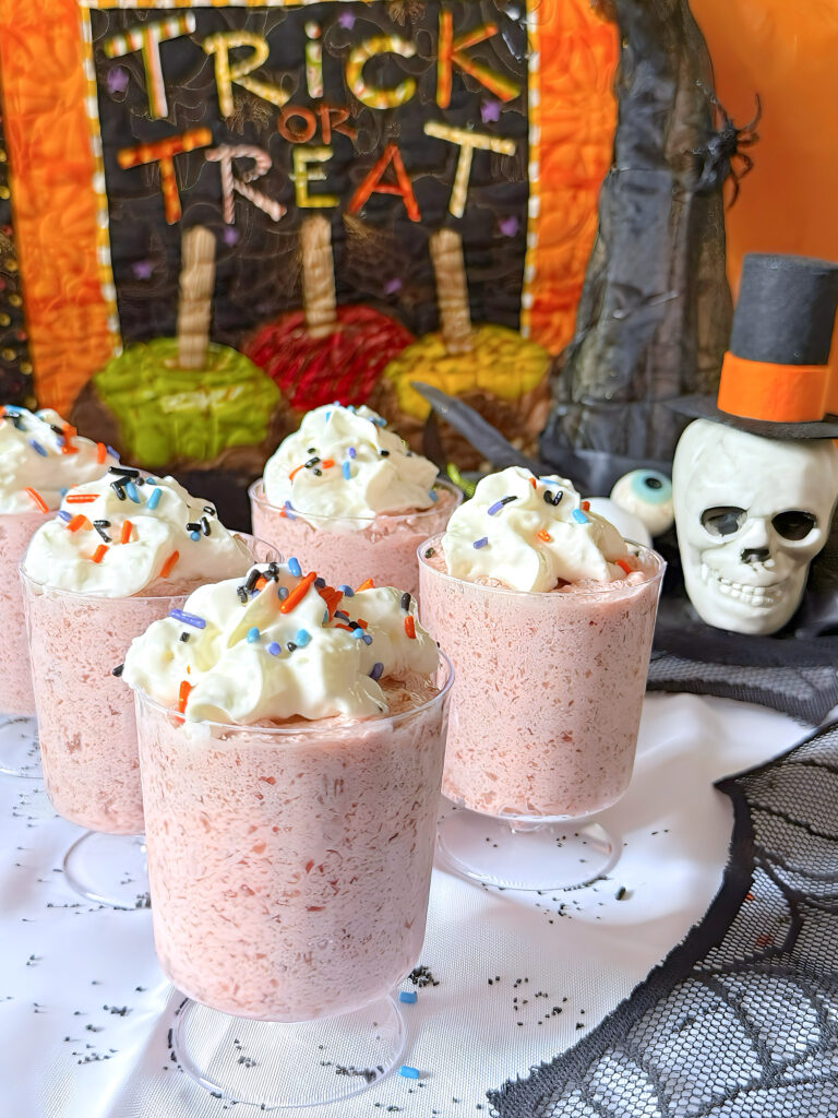Whisk together set Jello and pre-made whip cream. Top with whip cream and Halloween sprinkles or add gummy worms for a extra Halloween flare.